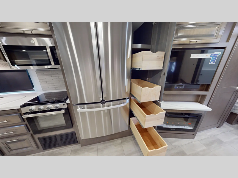 Sleeps 4 Slides 3 Length 37 ft 10 in Ext Width 8 ft 4 in Ext Height 12 ft 9 in Int Height 6 ft 10 in Exterior Color Carolina, Indigo, Poppy, Titanium Hitch Weight 5000 lbs GVWR 22000 lbs Fresh Water Capacity 80 gals Grey Water Capacity 52 gals Black Water Capacity 52 gals Furnace BTU 35000 btu Generator 6,000W Yamaha Fuel Type Gas Engine 7.3L V8 Chassis Ford F53 Horsepower 350 hp Fuel Capacity 80 gals Wheelbase 242 in Number Of Bunks 1 Available Beds King Torque 468 ft-lb Refrigerator Type Stainless Steel 3 Door Residential Refrigerator Size 18 cu ft Cooktop Burners 3 Number of Awnings 2 Axle Weight Front 8000 lbs Axle Weight Rear 15000 lbs LP Tank Capacity 24.5 Gal Water Heater Capacity 6 gal AC BTU 30000 btu TV Info LR 40" LED TV, BR 32" LED TV, Exterior 40" LED TV Awning Info 12' and 17' Encased Power with LED Lights Washer/Dryer Available Yes Gross Combined Weight 26000 lbs Shower Type Shower w/Seat Electrical Service 50 amp Similar Floorplans