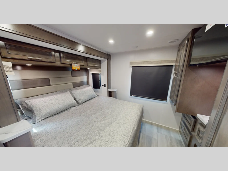 Sleeps 4 Slides 2 Length 34 ft 11 in Ext Width 8 ft 4 in Ext Height 12 ft 9 in Int Height 6 ft 10 in Exterior Color Carolina, Indigo, Poppy, Titanium Hitch Weight 5000 lbs GVWR 22000 lbs Fresh Water Capacity 80 gals Grey Water Capacity 42 gals Black Water Capacity 42 gals Furnace BTU 35000 btu Generator 6,000W Yamaha Fuel Type Gas Engine 7.3L V8 Chassis Ford F53 Horsepower 350 hp Fuel Capacity 80 gals Wheelbase 228 in Number Of Bunks 1 Available Beds King Torque 468 ft-lb Refrigerator Type Stainless Steel 3 Door Residential Refrigerator Size 18 cu ft Cooktop Burners 3 Number of Awnings 1 Axle Weight Front 8000 lbs Axle Weight Rear 15000 lbs LP Tank Capacity 24.5 Gal Water Heater Capacity 6 gal AC BTU 28500 btu TV Info LR 40" LED TV, BR 32" LED TV, Exterior 40" LED TV Awning Info 19' Encased Power with LED Lights Washer/Dryer Available Yes Gross Combined Weight 26000 lbs Shower Type Shower w/Seat Electrical Service 50 amp Similar Floorplans