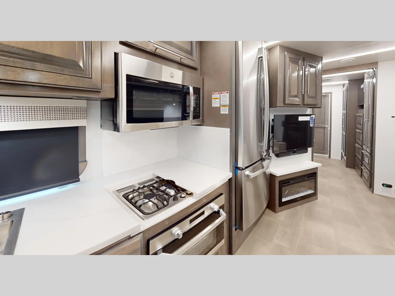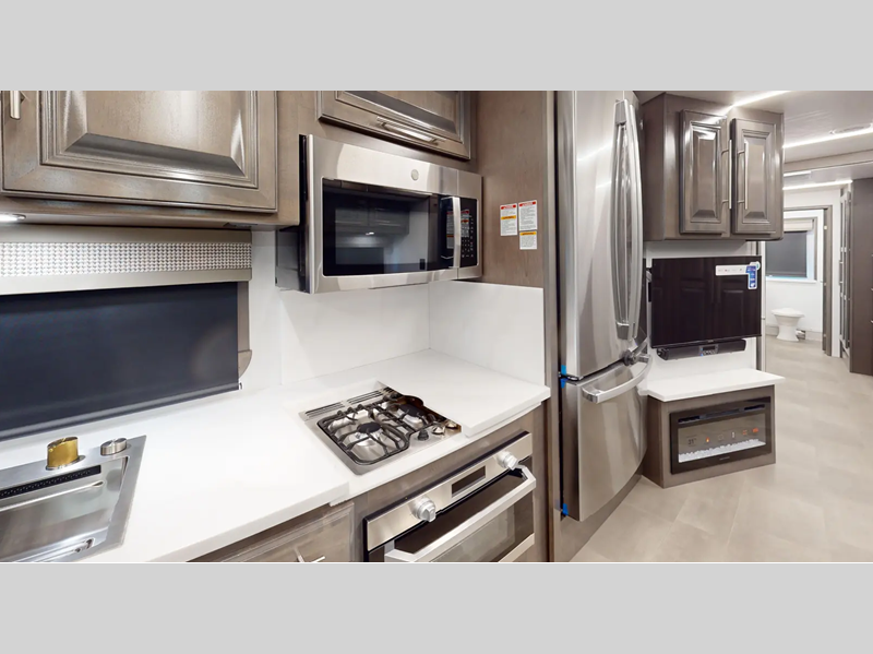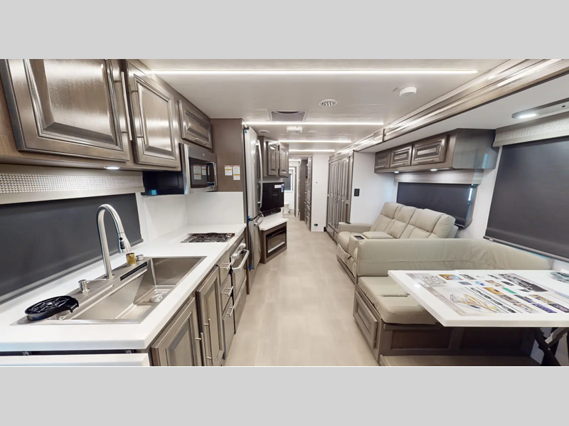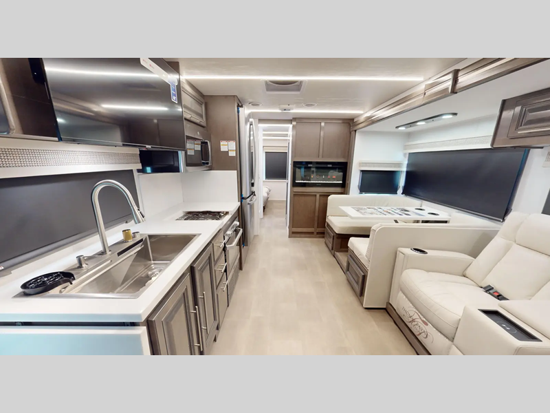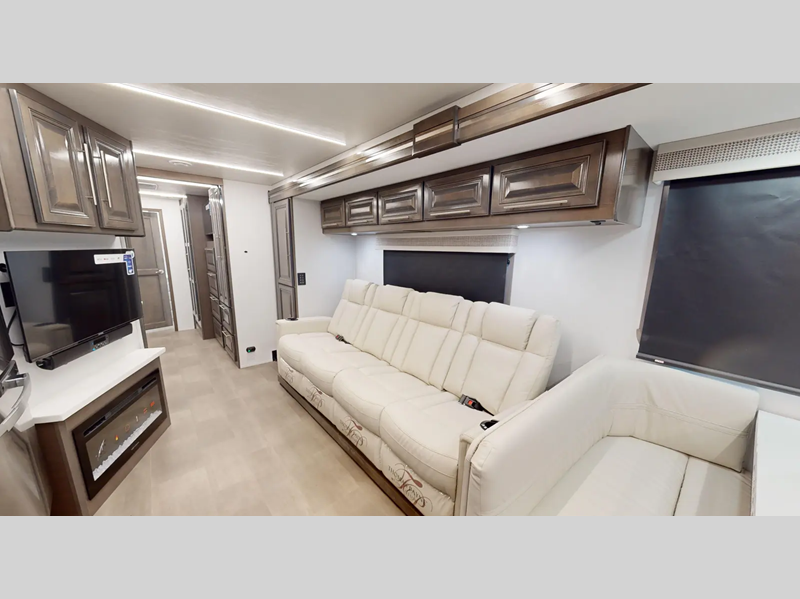 Sleeps 4 Slides 2 Length 37 ft 11 in Ext Width 8 ft 4 in Ext Height 12 ft 11 in Int Height 7 ft Exterior Color Azure, Columbia, Obsidian, Nautique ll Hitch Weight 5000 lbs GVWR 26000 lbs Fresh Water Capacity 73 gals Grey Water Capacity 52 gals Black Water Capacity 52 gals Furnace BTU 35000 btu Generator 6,000W Yamaha Fuel Type Gas Engine 7.3L V8 Chassis Ford F53 Horsepower 350 hp Fuel Capacity 80 gals Wheelbase 252 in Number Of Bunks 1 Available Beds King Torque 468 ft-lb Refrigerator Type Stainless Steel 3 Door Residential w/Water and Ice Refrigerator Size 18 cu ft Cooktop Burners 3 Number of Awnings 1 Axle Weight Front 9000 lbs Axle Weight Rear 17500 lbs LP Tank Capacity 24.5 Gal Water Heater Capacity 10 gal AC BTU 30000 btu TV Info LR 40" LED TV, BR 32" LED TV, Ext. 40" TV Awning Info 20' Encased Power Patio Awning with LED Light Washer/Dryer Available Yes Gross Combined Weight 30000 lbs Shower Type Shower w/Seat Electrical Service 50 amp Similar Floorplans
