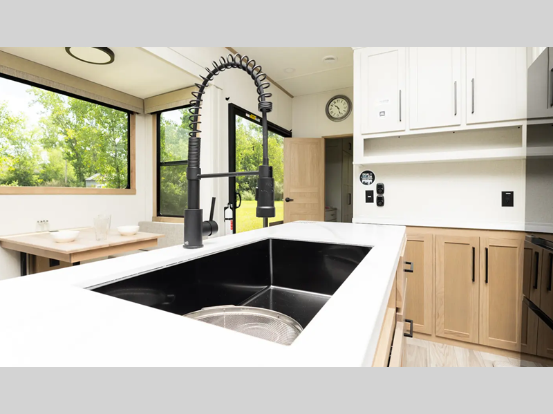 Each destination trailer features a painted full profile fiberglass front cap with a windshield, an underbelly armor, and Lippert auto adjust brakes for a smooth towing experience. Inside, you will love the solid surface kitchen countertops, residential stain resistant carpet, decorative backsplash, and many more comforts.
