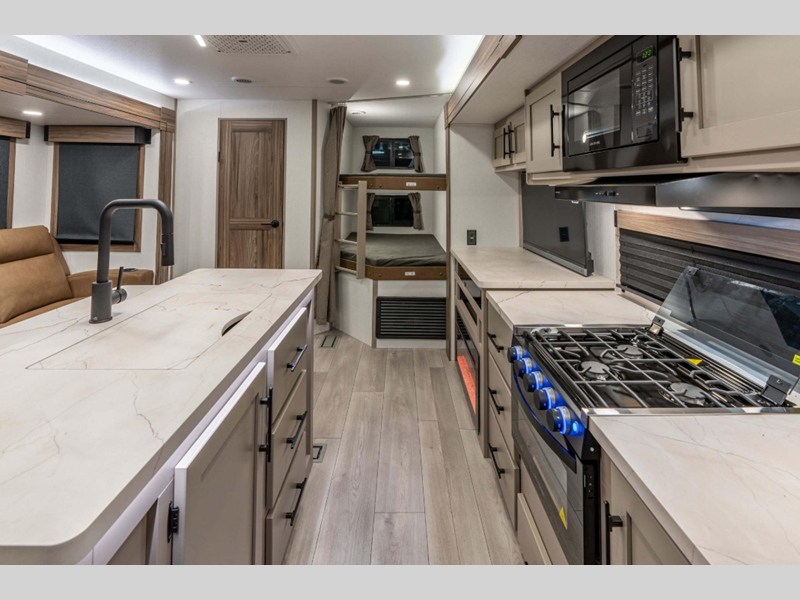 Sleeps 5 Slides 2 Length 30 ft Ext Width 8 ft Ext Height 11 ft 4 in Int Height 6 ft 10 in Interior Color Mink, Spice Film, Uni Sandgrau Hitch Weight 840 lbs GVWR 8800 lbs Dry Weight 7070 lbs Cargo Capacity 1730 lbs Fresh Water Capacity 45 gals Grey Water Capacity 64 gals Black Water Capacity 32 gals Tire Size 15" Furnace BTU 30000 btu Number Of Bunks 2 Available Beds King Refrigerator Type 12V Refrigerator Size 10 cu ft Cooktop Burners 3 Number of Awnings 1 Axle Weight 6230 lbs LP Tank Capacity 20 lbs Water Heater Type Tankless AC BTU 13500 btu TV Info LR LED TV Awning Info 19' Electric with LED Lights Axle Count 2 Number of LP Tanks 2 Shower Type Radius Electrical Service 50 amp Similar Floorplans