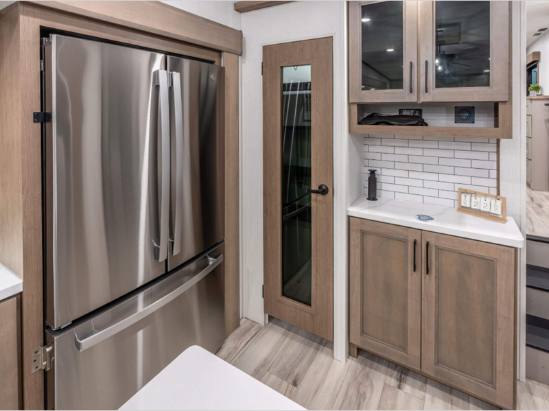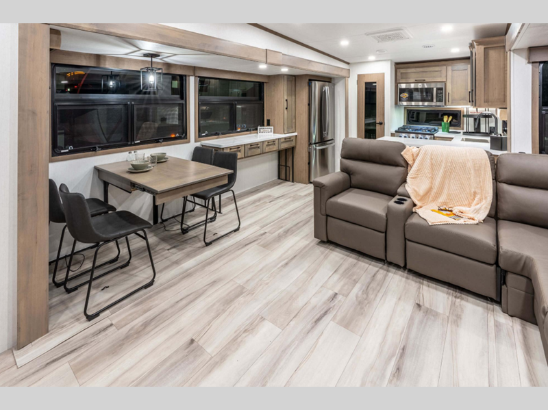 Sleeps 3 Slides 3 Length 37 ft 6 in Ext Width 8 ft Ext Height 12 ft 8 in Interior Color Mink, Pebble Hitch Weight 2190 lbs GVWR 13795 lbs Dry Weight 11770 lbs Cargo Capacity 2025 lbs Fresh Water Capacity 76 gals Grey Water Capacity 90 gals Black Water Capacity 50 gals Tire Size 16" Furnace BTU 35000 btu Available Beds King Refrigerator Type Residential Refrigerator Size 18 cu ft Convection Cooking Yes Cooktop Burners 4 Shower Size 30" x 36" Number of Awnings 1 Axle Weight 9580 lbs LP Tank Capacity 30 lbs Water Heater Type On Demand Tankless AC BTU 15000 btu TV Info LR 65" Smart LED TV Awning Info 16' Power w/LED Light Strip Axle Count 2 Washer/Dryer Available Yes Number of LP Tanks 2 Shower Type Shower w/Seat Electrical Service 50 amp Similar Floorplans