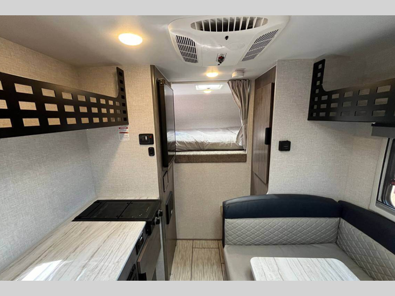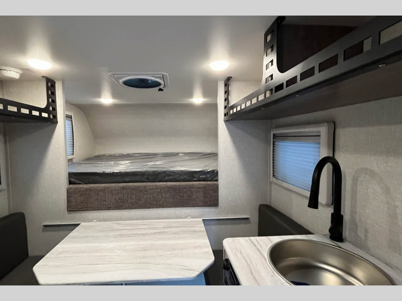 Each camper features Azdel interior walls, a one-piece roof, and block foam insulation throughout to help extend your camping season. The overhead Molle panel storage space will let you pack essentials out of the way, and the 12V/USB charging ports will keep your electronics powered up. Outside, you'll find LED lights, a swing-out entry assist handle, Keyed-Alike doors, and an exterior wash station to wash off hiking gear.