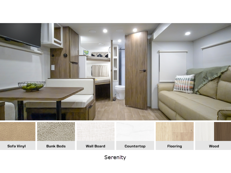 Sleeps 8 Slides 1 Length 29 ft 11 in Ext Width 8 ft Ext Height 11 ft 2 in Int Height 6 ft 8 in Interior Color Serenity Hitch Weight 815 lbs GVWR 8800 lbs Dry Weight 6454 lbs Fresh Water Capacity 60 gals Grey Water Capacity 49 gals Black Water Capacity 49 gals Tire Size 225/75R15E Furnace BTU 30000 btu Number Of Bunks 2 Available Beds Olympic Queen Refrigerator Type 12 Volt Refrigerator Size 10 cu ft Cooktop Burners 3 Shower Size 30" x 35" Number of Awnings 1 Axle Weight 4400 lbs LP Tank Capacity 20 lbs Water Heater Type Tankless AC BTU 13500 btu TV Info LR Smart TV Awning Info 19' Power w/LED Lights Axle Count 2 Number of LP Tanks 2 Shower Type Standard Similar Floorplans