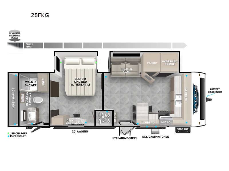 You will fall in love with this travel trailer as soon as you walk through the door! One of the dual entry doors leads directly into the front kitchen and living area which has theater seating, three bar stools to enjoy meals at the countertop, plus a bench right at the entrance to make putting your shoes on easier. Inside the master suite is a Versa-Tilt custom king bed slide across from a dresser with TV prep, an area prepped to add an optional washer and dryer, and access to the full rear bathroom. You will find a walk-in shower to freshen up in each morning, recessed storage, and the second entrance/exit door to the unit. You even have an exterior camp kitchen to prepare meals outdoors, a 20' awning to protect you rain or shine and a Versa garage for your items!